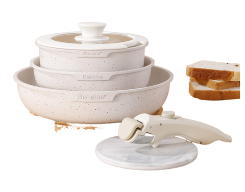 नया आगमन 8PCS बेज ग्रेनाइट डाई कास्टिंग कुकवेयर सेट इंडक्शन बॉटम हॉट सेलिंग सेट में